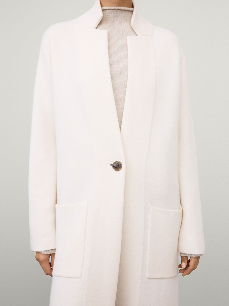 A LISA YANG mainstay, the Amie coat is crafted in our knitted double face cashmere with a luxuriously weighty hand feel. The straight, structured silhouette is detailed with notch lapels, slightly dropped shoulders, a single button closing and patch pockets.