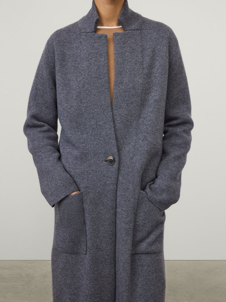 A LISA YANG mainstay, the Amie coat is crafted in our knitted double face cashmere with a luxuriously weighty hand feel. The straight, structured silhouette is detailed with notch lapels, slightly dropped shoulders, a single button closing and patch pockets.