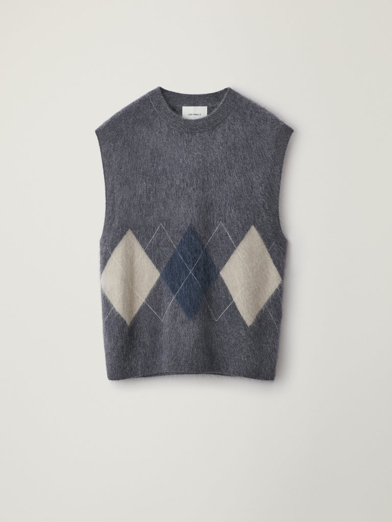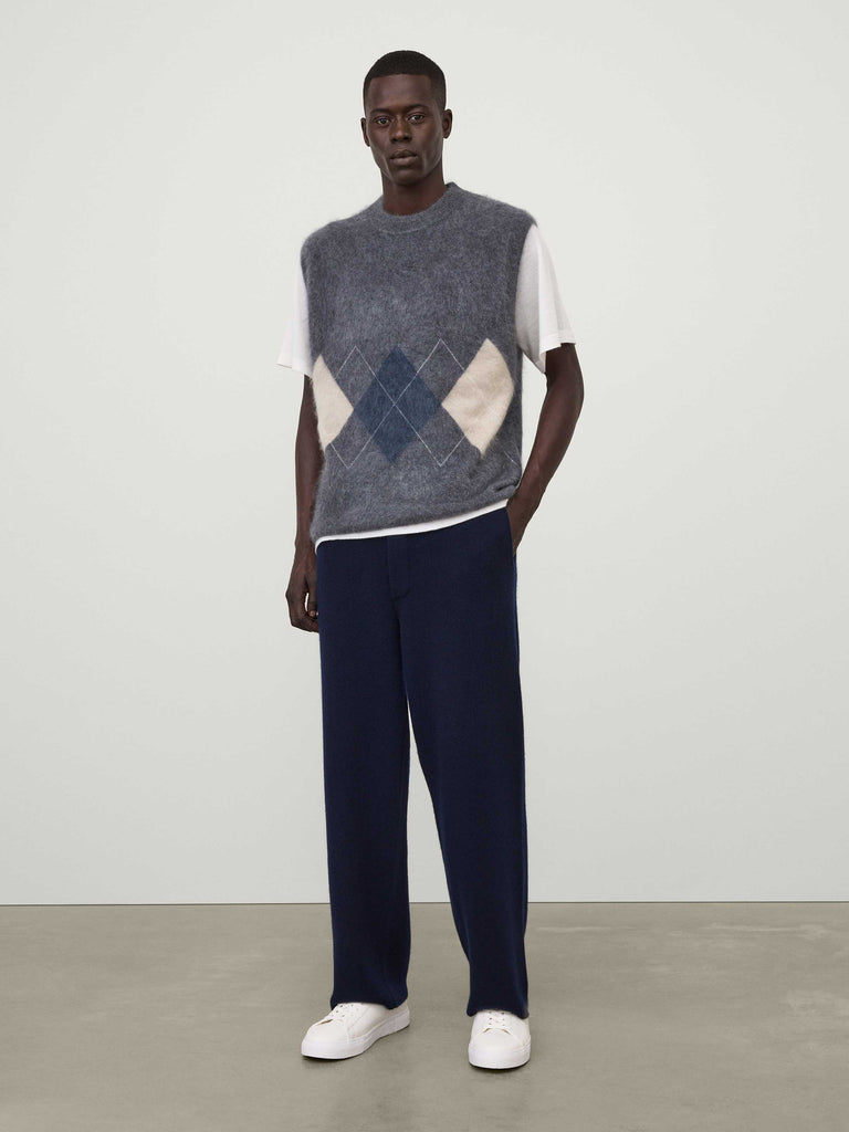 A staple piece, the Dennis vest is reworked in our signature brushed cashmere with a graphic Argyle pattern. The relaxed fit silhouette features a crew neck and ribbed trims for a structured finish.