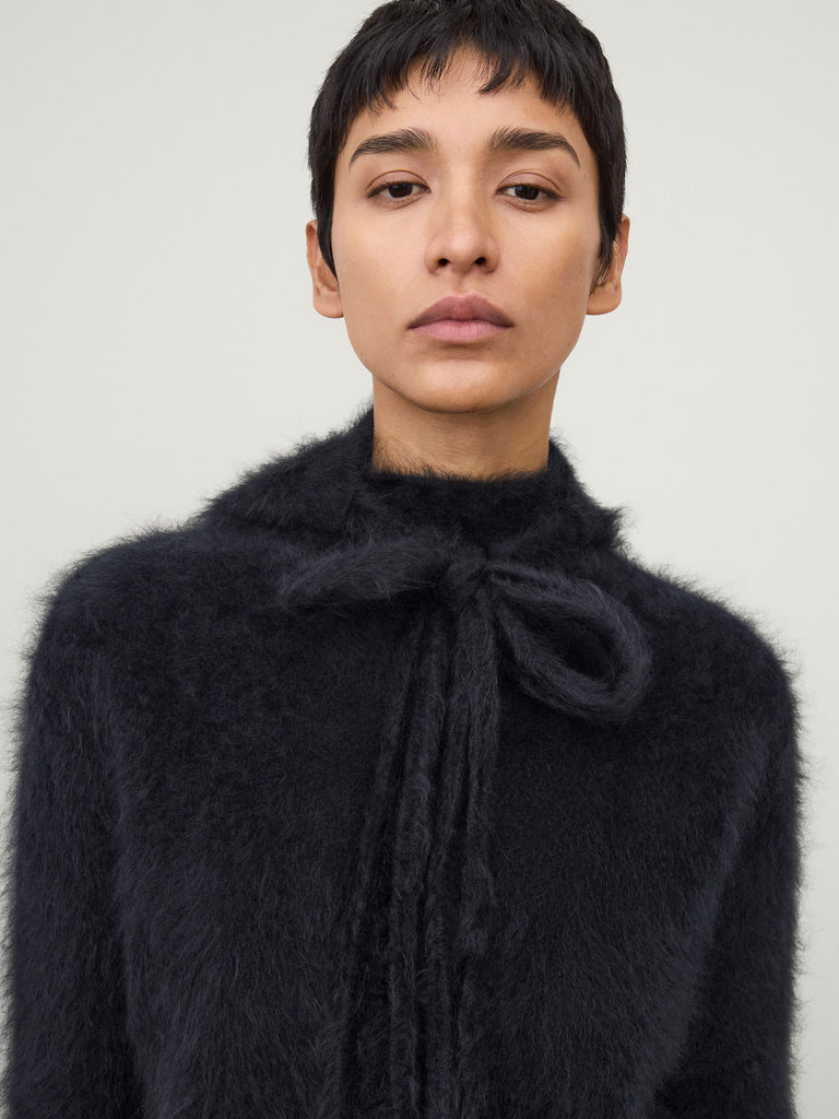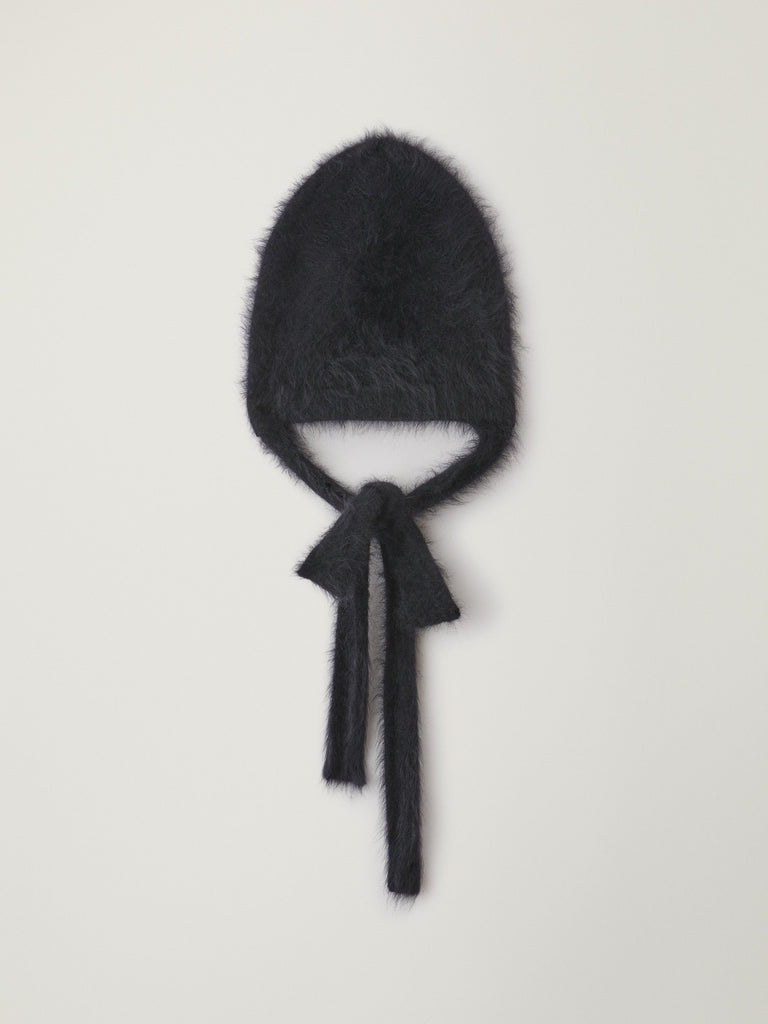 A new hat silhouette, the Brushed tied hood is knitted in our signature brushed cashmere with a soft texture and tactile hand. The hood silhouette is finished with long brushed cashmere ties that can be tied into a bow at the front.
