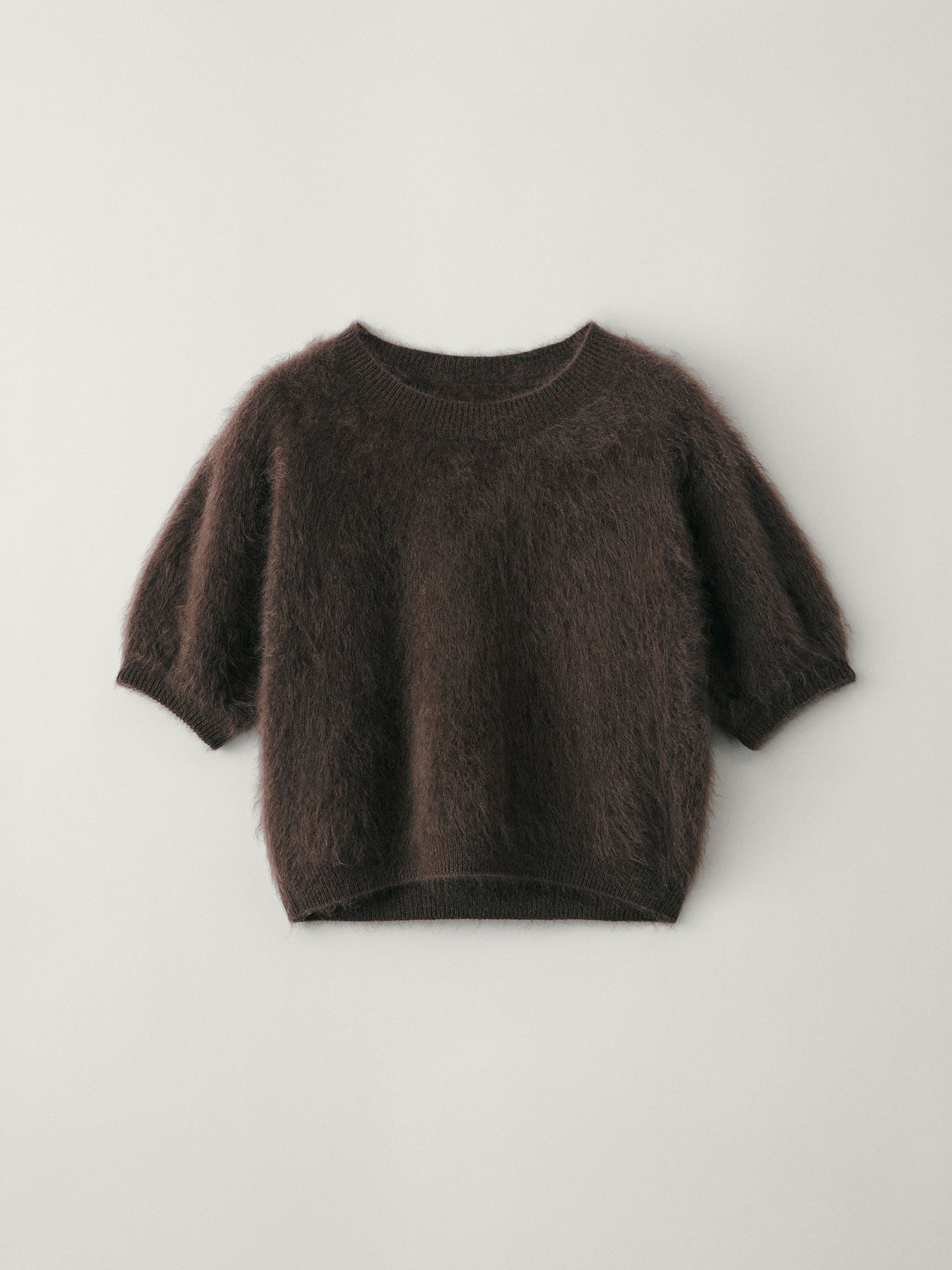 A sumptuous top with texture, the Juniper sweater is knitted in our signature brushed cashmere drawing from the sheen and luster of mohair. The generous fit, slightly cropped silhouette is complete with a crew neck, dropped shoulders and short sleeves.