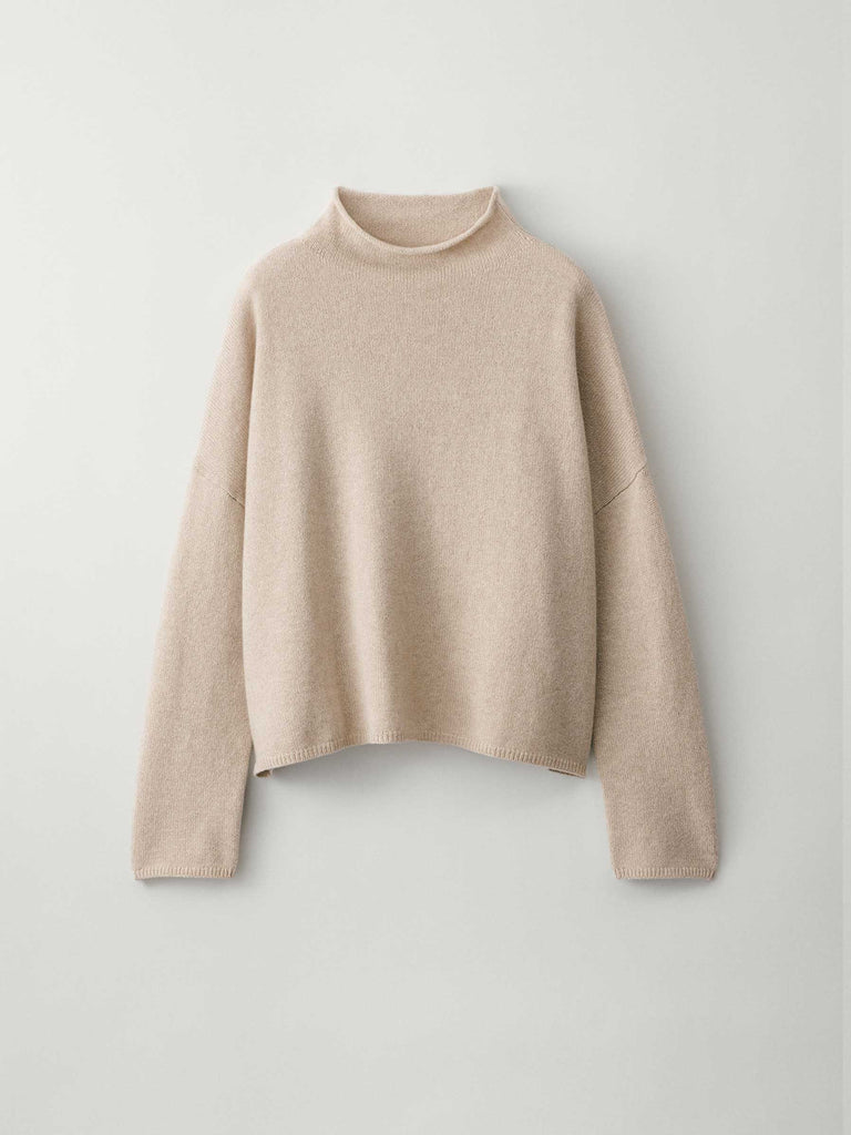 A plush top layer, the Sandy sweater is crafted in rich, heavy knit cashmere to wide proportions. The enveloping silhouette creates effortless drapes at the front and back, made sublime by the generous rolled mock neck and relaxed dropped shoulders.