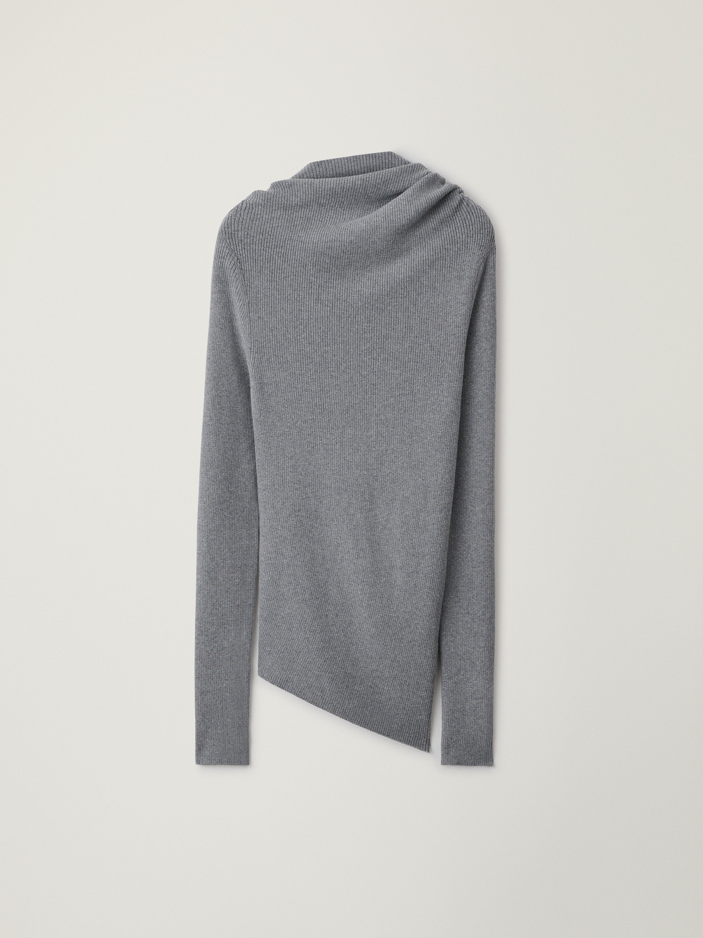 A dynamic silhouette, the Agie sweater takes our rib-knitted cotton cashmere composition from day to evening. The form-fitting, tubular frame has intricate drapes along the front and features an asymmetric neck and hemline and extended sleeves.