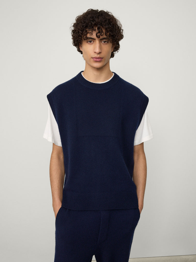 The Dennis vest is a plain knit, relaxed body silhouette with a panel of neat ribbing. Ribbed trims give the Dennis a structure finish whilst retaining its casual feel. Layer it over the Johannes T-shirt.