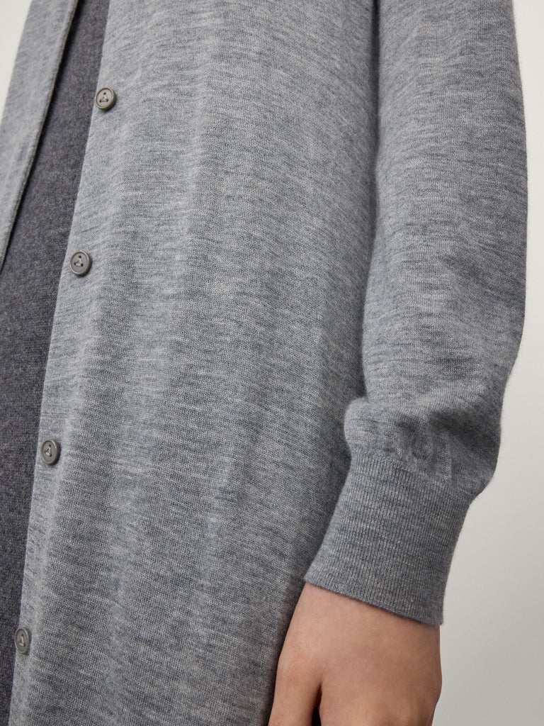 A knitted shirt envisioned as a dress, the Erika dress is crafted in our finest, most delicate 18 gauge cashmere fabric. The regular fit, longline silhouette is detailed with a button-front closure that stretches down the hem, a neatly collared neckline, slim full-length sleeves and ribbed trims. Wear it closed on its own or open layered over fine knit pieces.