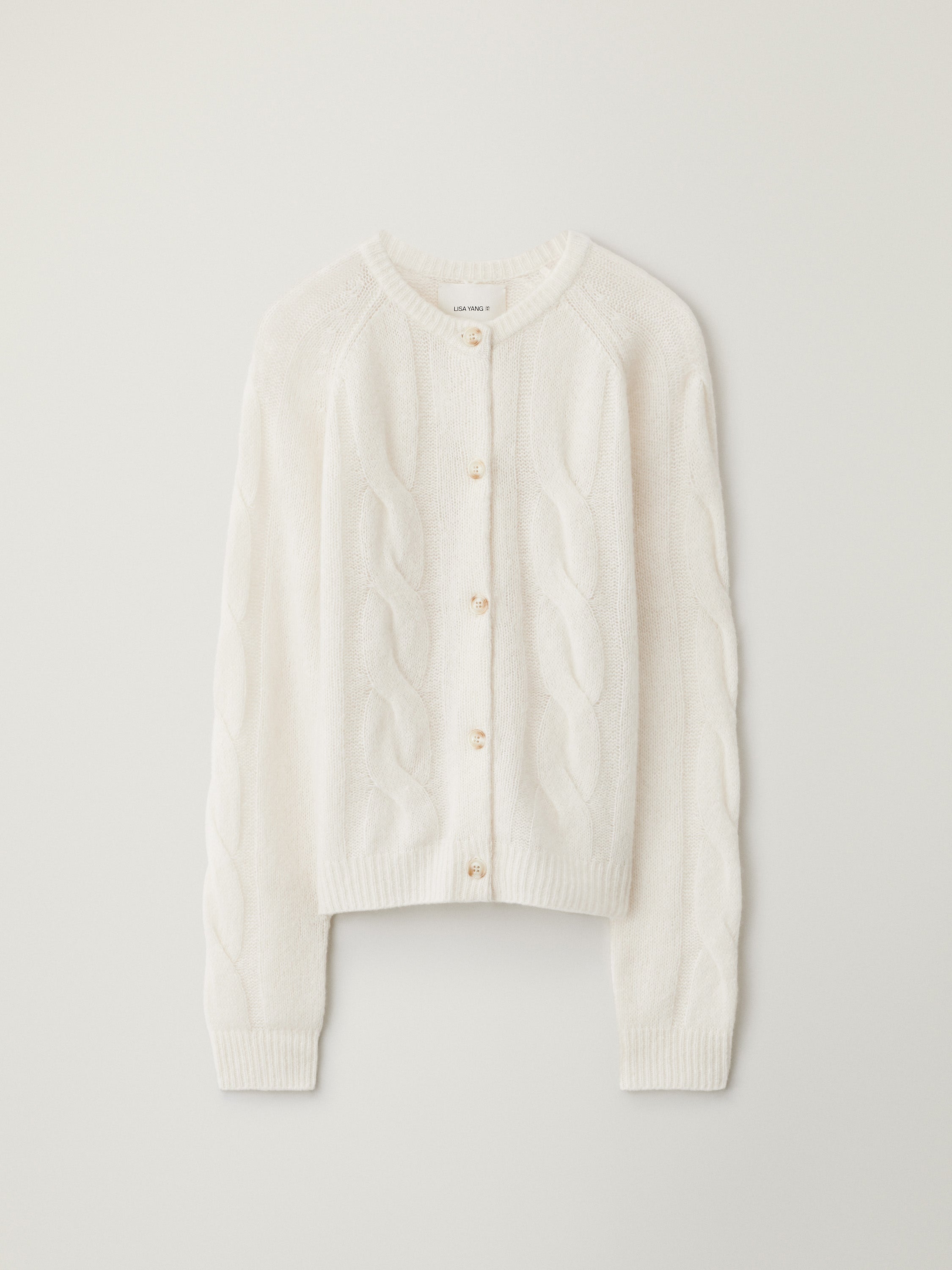 A new cable knit, the Gwyneth cardigan is crafted in our delicate silk cashmere composition with scaled-up cables – a graphic iteration of the classic pattern. The regular fit silhouette features a ribbed round neck, full-length raglan sleeves, a button fastening and ribbed hems.