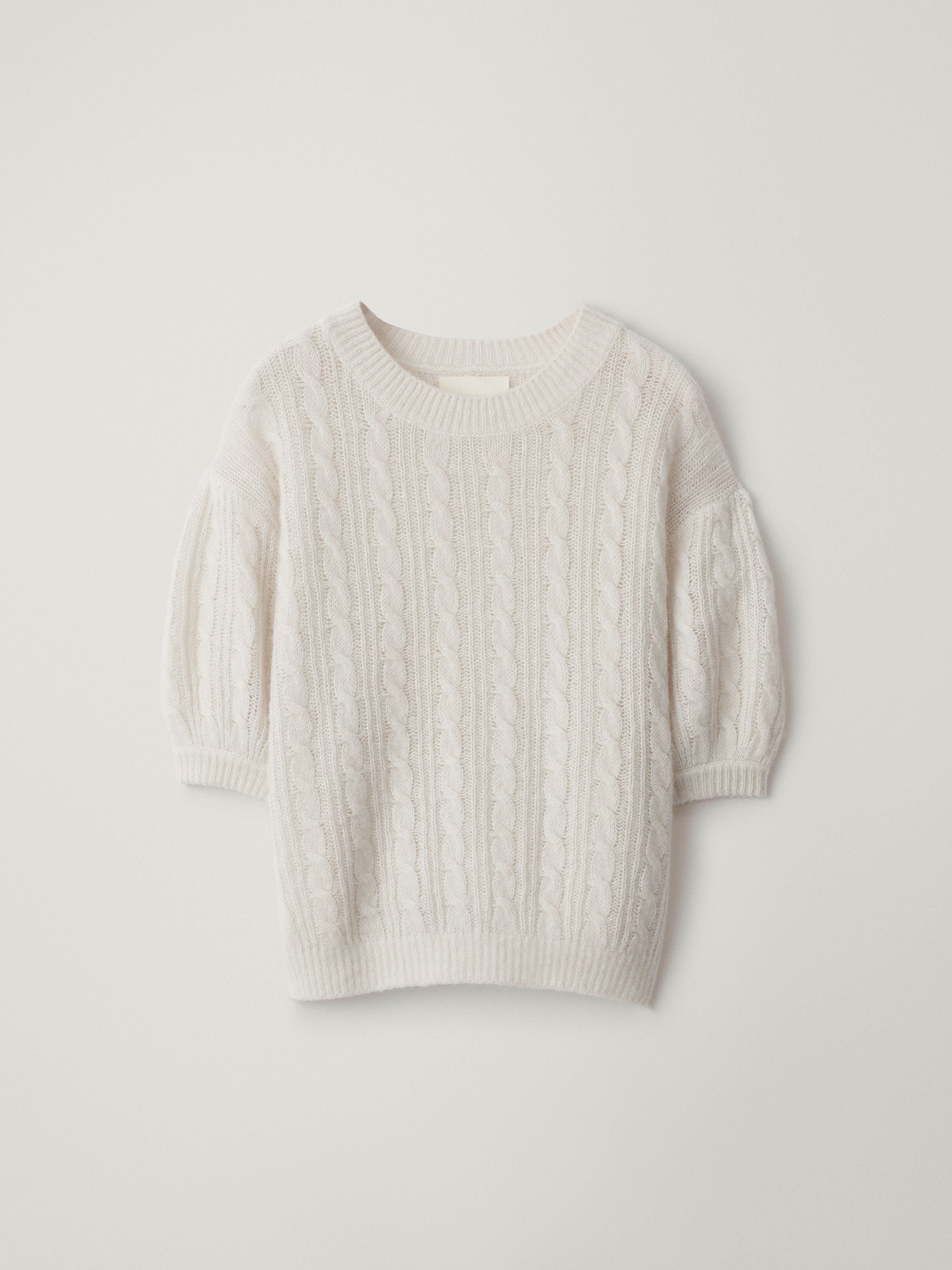 A softly voluminous top, the Kenzie sweater is cable knitted in our delicate silk cashmere composition. The relaxed fit, cropped silhouette features a wide, round neckline, short puff sleeves, and ribbed trims throughout.