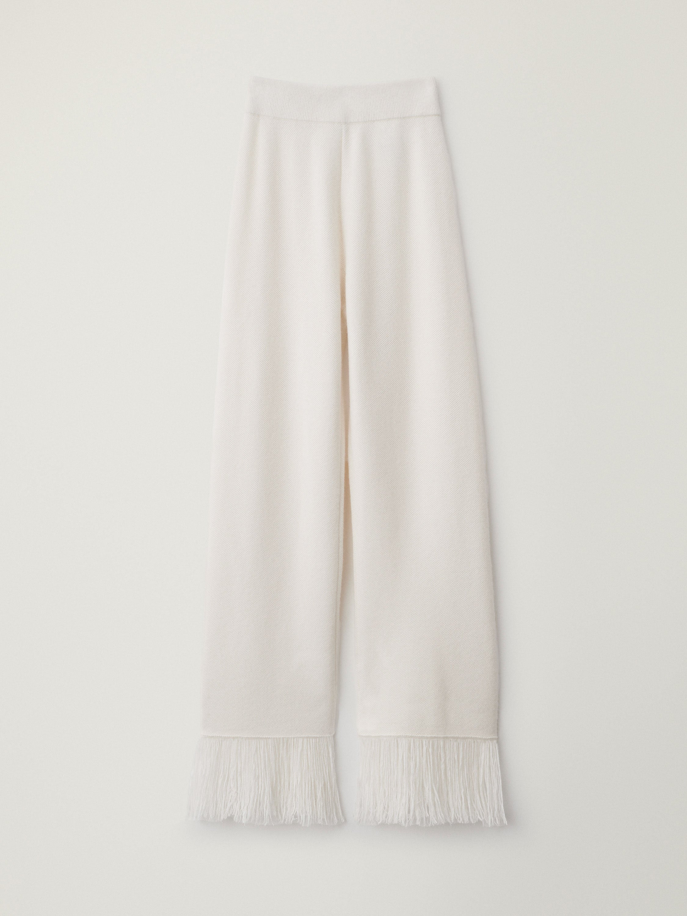 A new trouser silhouette, the Kiera trouser is crafted in softly textured honeycomb knit cashmere. The straight, wide leg silhouette sits comfortably at the waist and is detailed with fringes at the hem which length can be adjusted by cutting.
