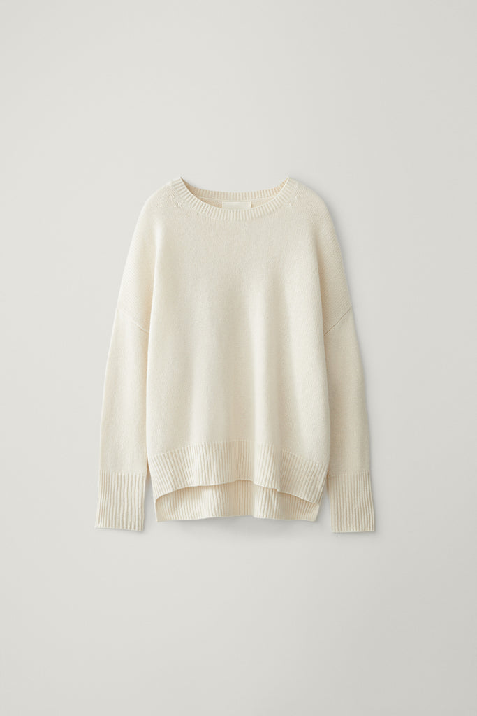 A directional crewneck, the Mila sweater is crafted in substantial, heavy knit cashmere. Draping the body with its relaxed silhouette, the sweater is defined by dropped shoulders, full-length sleeves and a graphic hem which extend to longer lengths at the back.