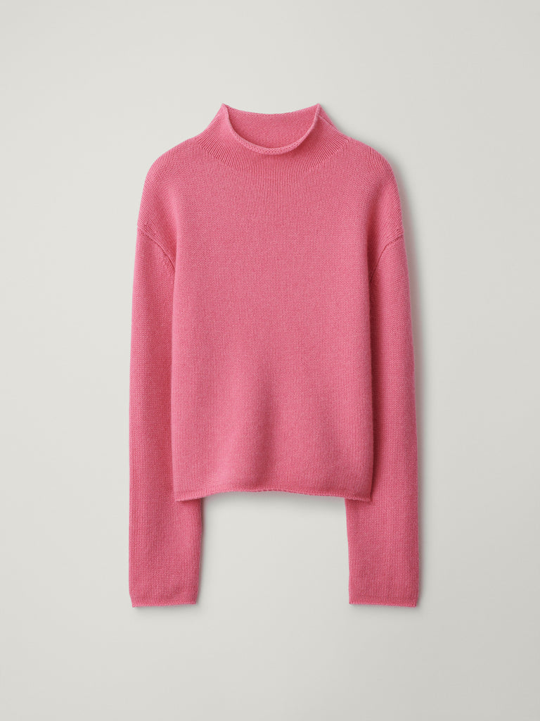 A relaxed silhouette with structure, the Nelsie sweater is crafted in heavy knit cashmere with a textured look and feel. The relaxed fit silhouette is balanced by a structured mock neck with a chain link finish, full-length sleeves and a cropped hem with raw edges.