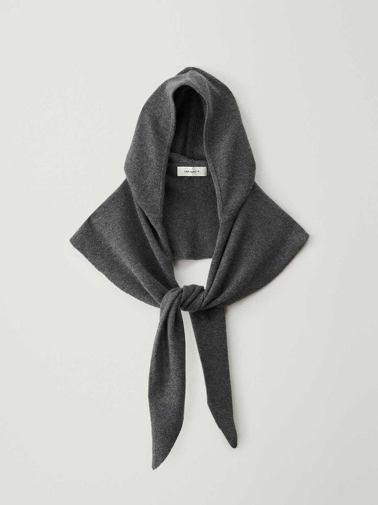 The Rina hooded scarf is knitted in a light 12gg plain-knit cashmere that can be worn up or down, tied and tucked under the collar. The slim ribbed trim frames the face and defines its silhouette.