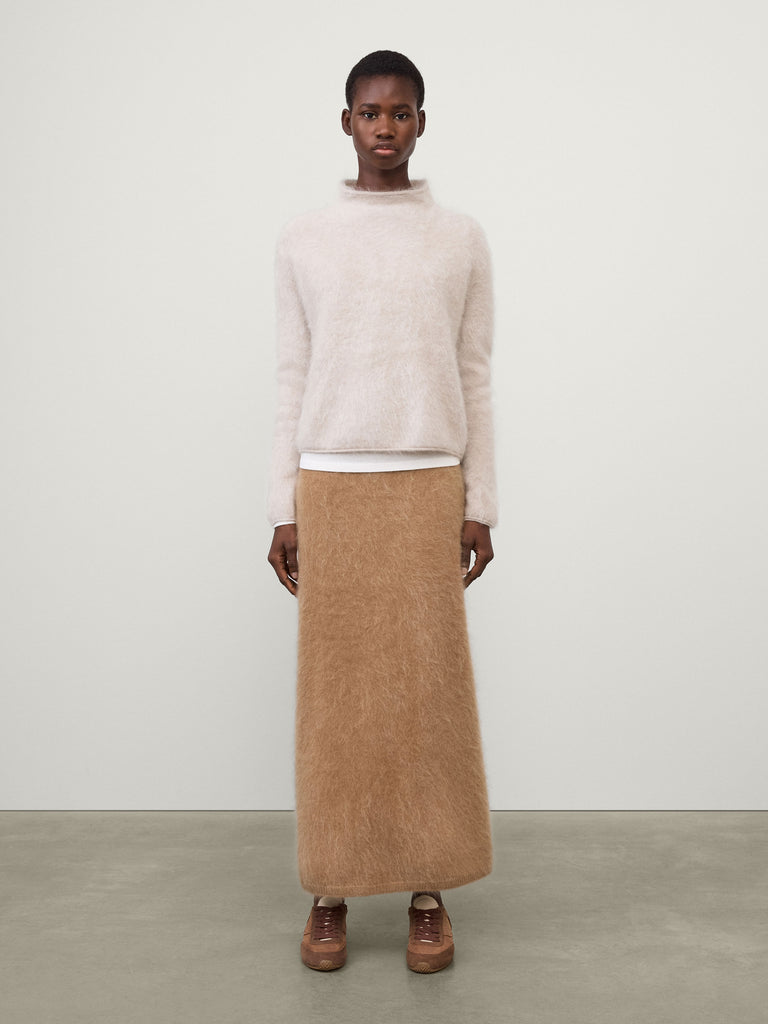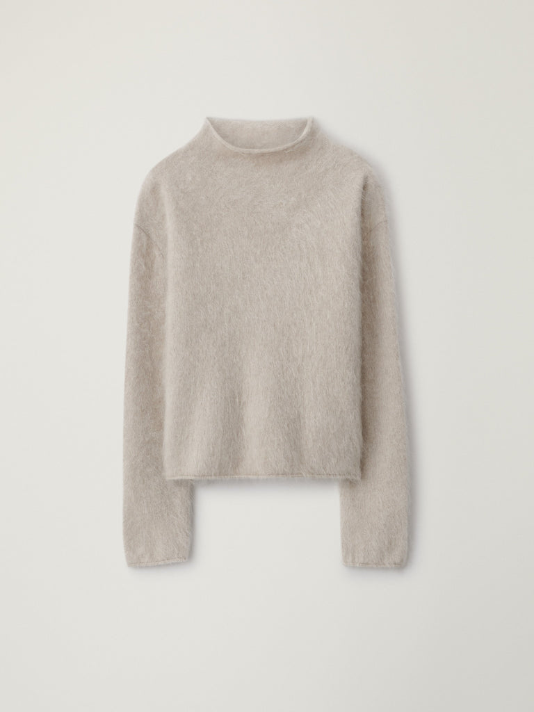 A signature silhouette, the Sandy sweater is reworked in comforting, cloud-like brushed cashmere. The regular fit, wide silhouette creates a natural drape at the front and back and features a rolled mock neck, dropped shoulders, full-length sleeves and a clean hem.